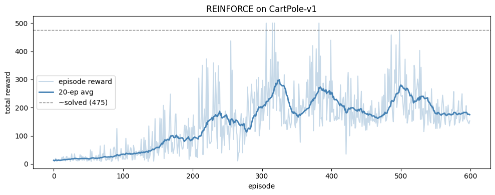 print(f"Episode {episode:4d} | reward {total_reward:6.1f} | {window}-ep avg {avg:6.1f}")